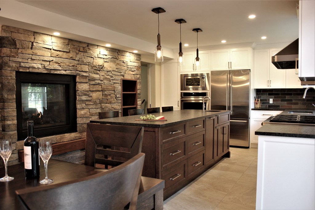 Cette rénovation du rez-de-chaussée a pour pièce maîtresse un magnifique foyer à double face, orné de pierre et de bois, qui s’ouvre à la fois sur le salon et la cuisine. La cuisine classique a été agrandie pour répondre aux besoins d’espace et permettre une expérience culinaire plus agréable. L’installation de portes-patio apporte une abondance de lumière naturelle dans la nouvelle salle à manger. Le salon bénéficie d’une plus grande intimité grâce à l’ajout d’une porte de grange. La salle d’eau et la buanderie ont également été rénovées pour répondre aux besoins modernes de la famille, tout en étant esthétiquement plaisantes.