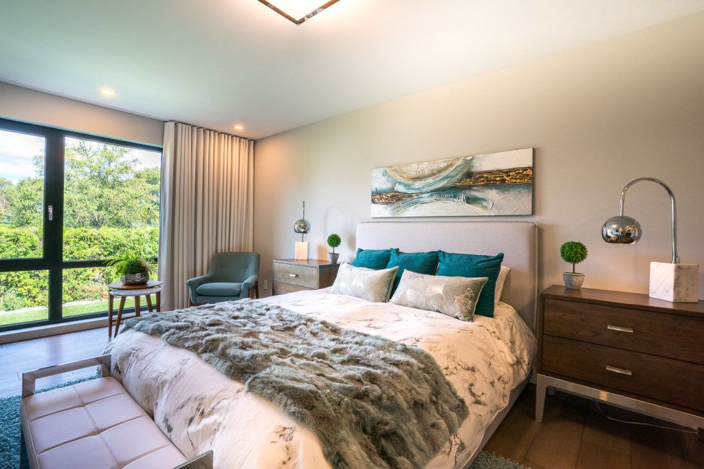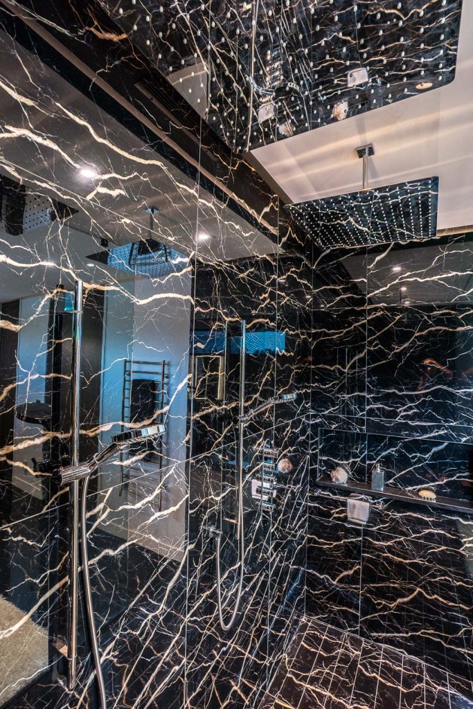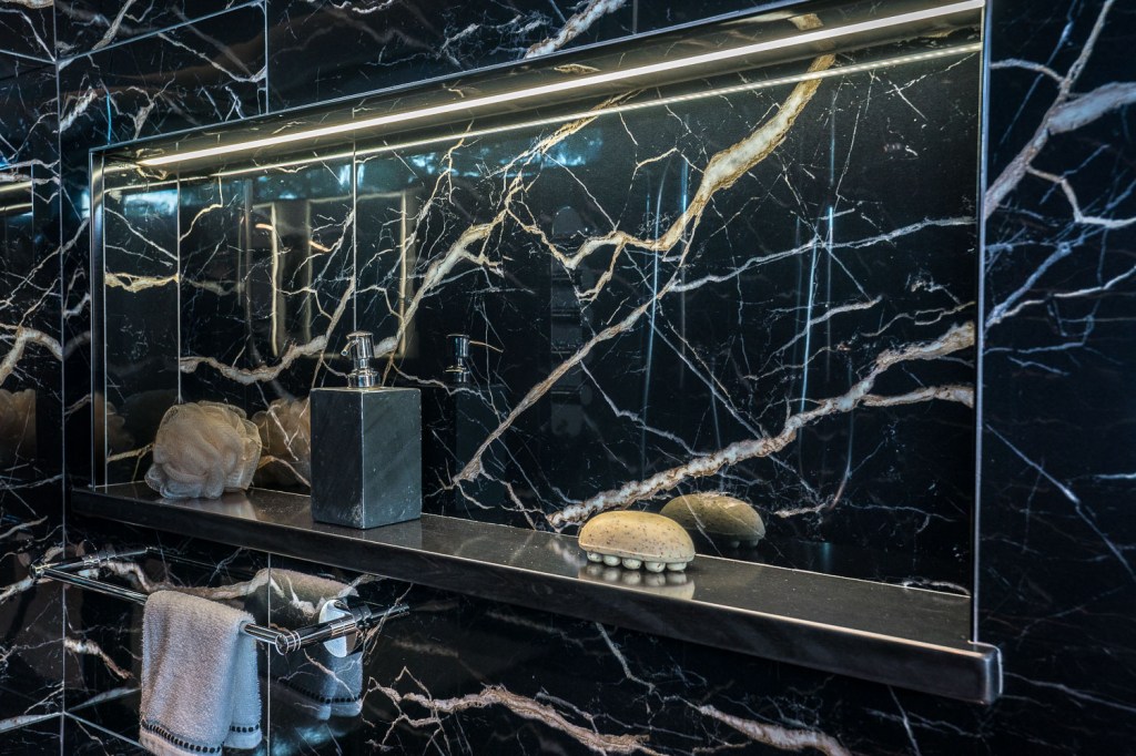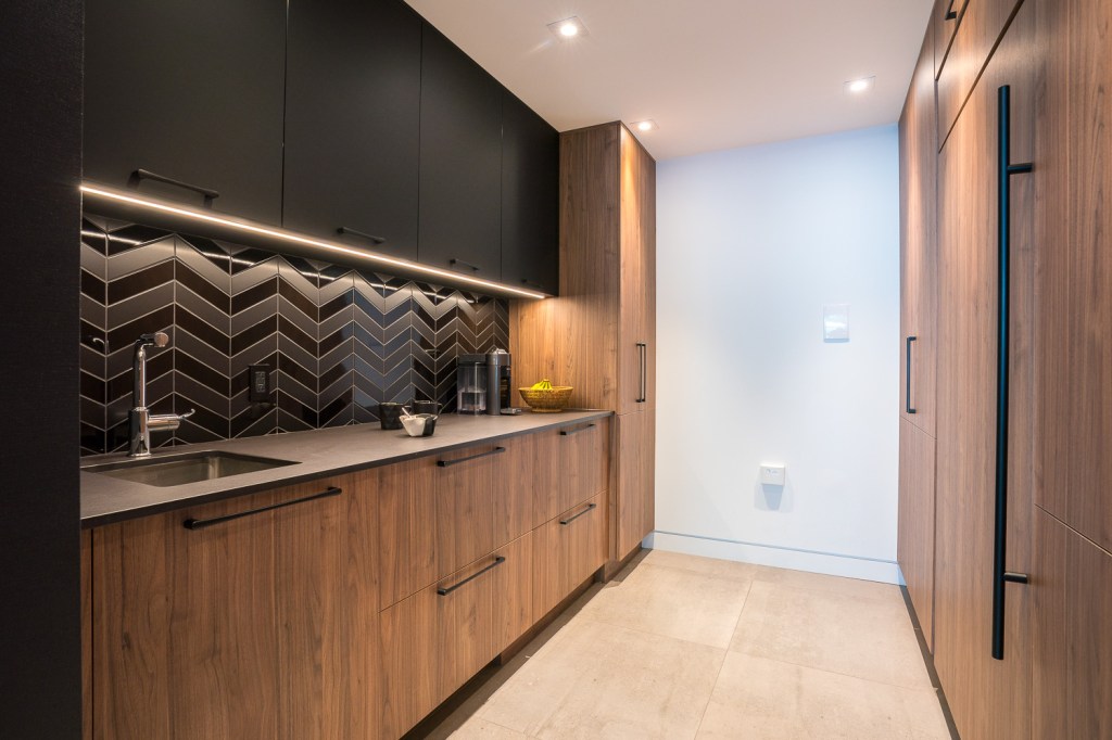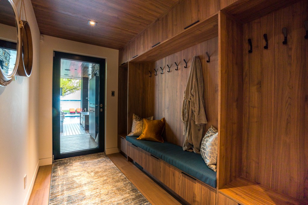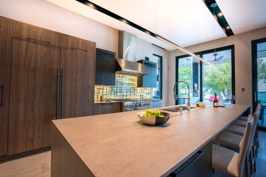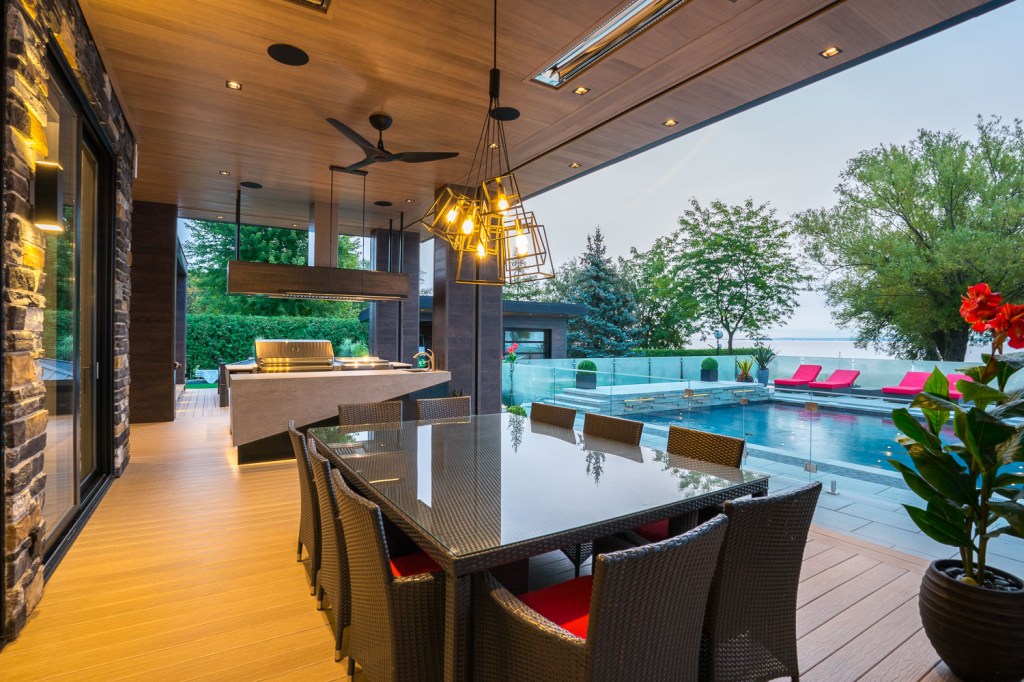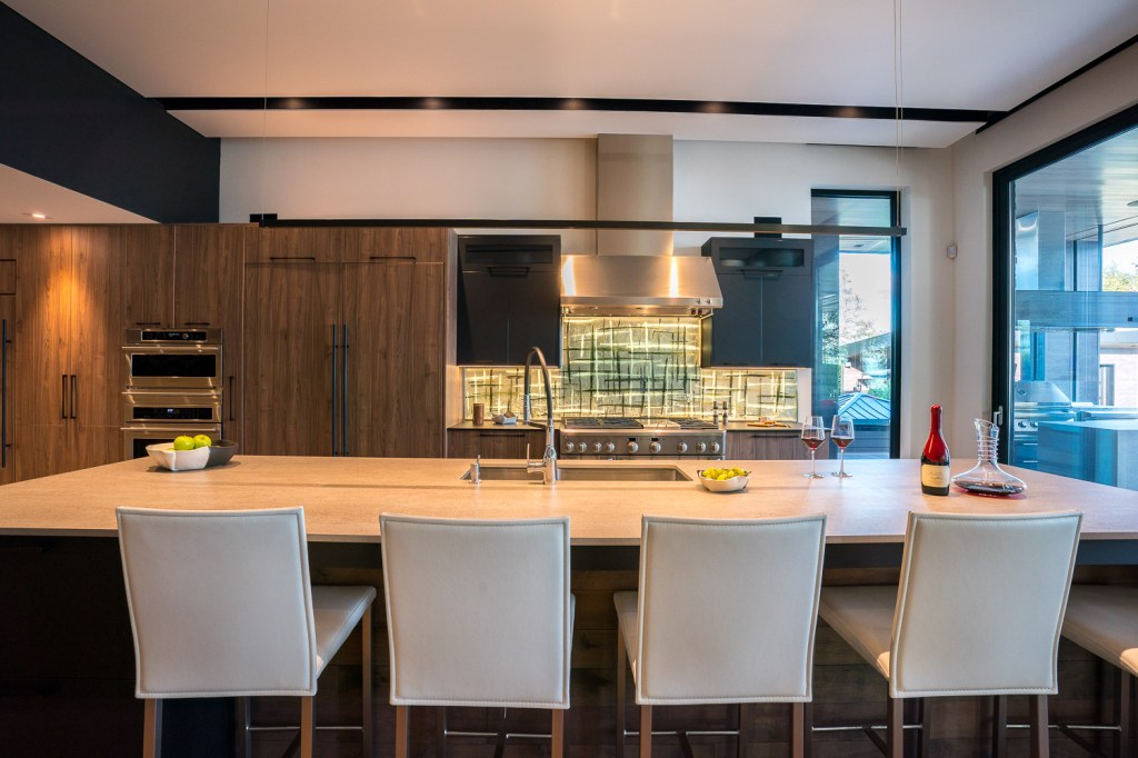 Au-delà des textures, des couleurs et de l’éclairage, la volumétrie des pièces a été travaillée avec exactitude, ne laissant un sol, un mur ou un plafond au dépourvu sur plus de 12 000 pieds carrés. La géométrie des espaces basée sur les plans de l’architecte, les formes de l’ameublement et les motifs ont été étudiées et travaillées avec minutie. Les grands espaces sont de beaux défis à rendre chaleureux. C’est pourquoi l’agencement des matériaux, des formes et des couleurs est si important à l’équilibre. Il y a peu de mur blanc en gypse dans cette demeure et lorsqu’ils le sont, il y a une intention. Dès que l’on passe la porte d’entrée, nous sommes envahis d’un désir hypnotique d’avancer dans la maison, de découvrir la prochaine ingéniosité, d’être émerveillé par les agencements. Dès que l’on passe la porte menant à la terrasse, on se ravie de la participation de la designer d’intérieur au design extérieur. Ces sentiments que l’on ressent, l’extase, c’est ce qui différencie un projet design, d’un projet Catherine Séguin Design.